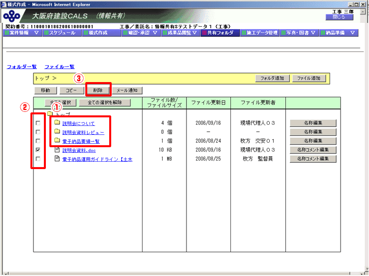 削除したいファイル・フォルダにチェックを入れます(複数指定可)。